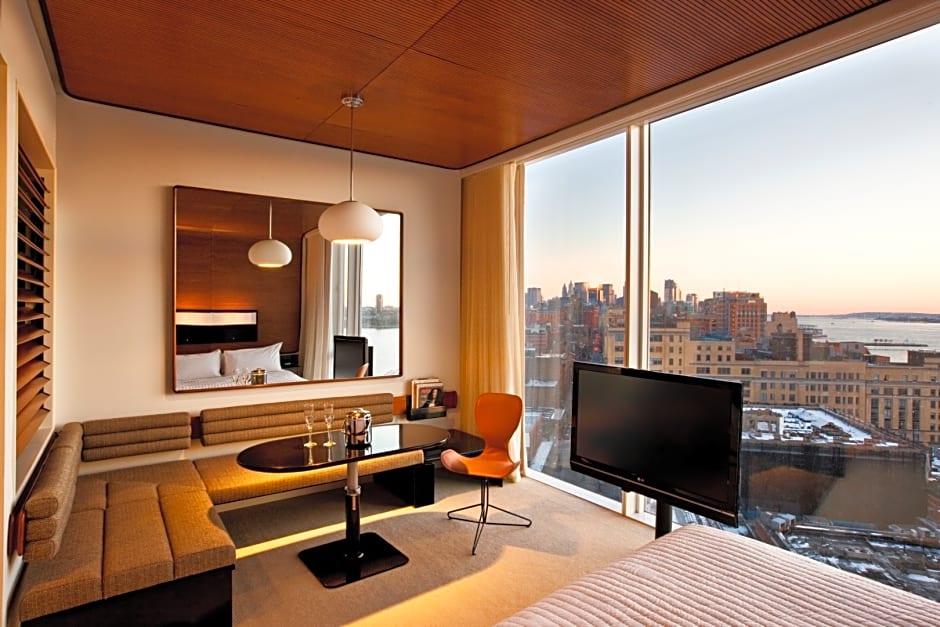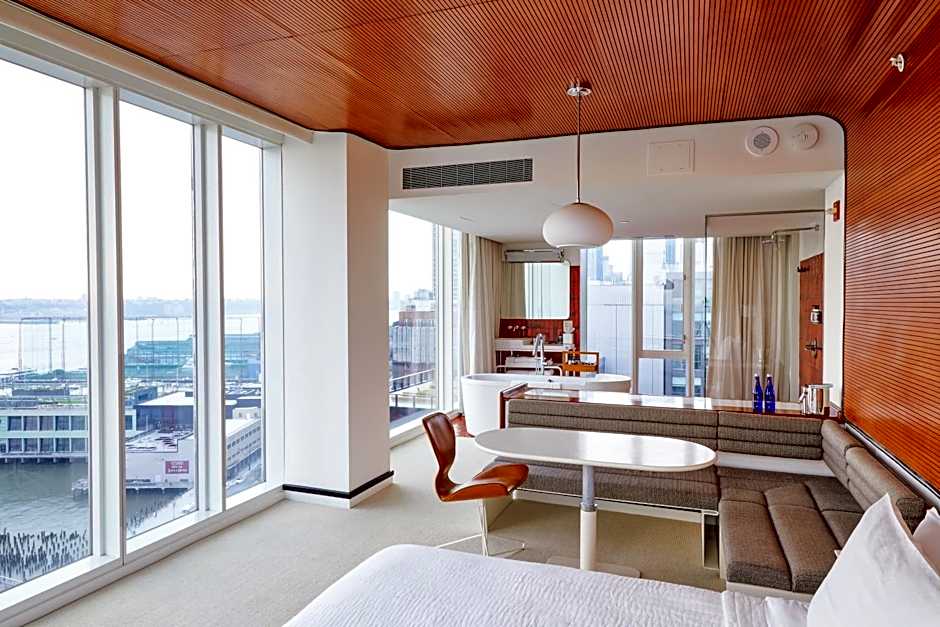 This room features southern views of the downtown skyline and the mighty Hudson River. There is a full wall of floor-to-ceiling windows, a queen-size bed, a drenching rain shower and tub with city views, and a working/dining alcove. Cozy hooded robes and a Bluetooth speaker come standard, naturally.