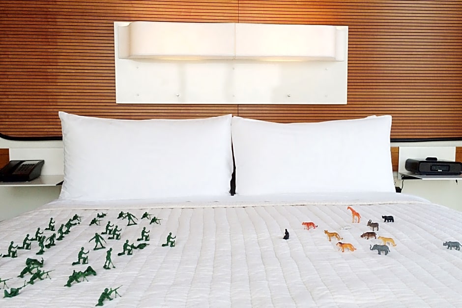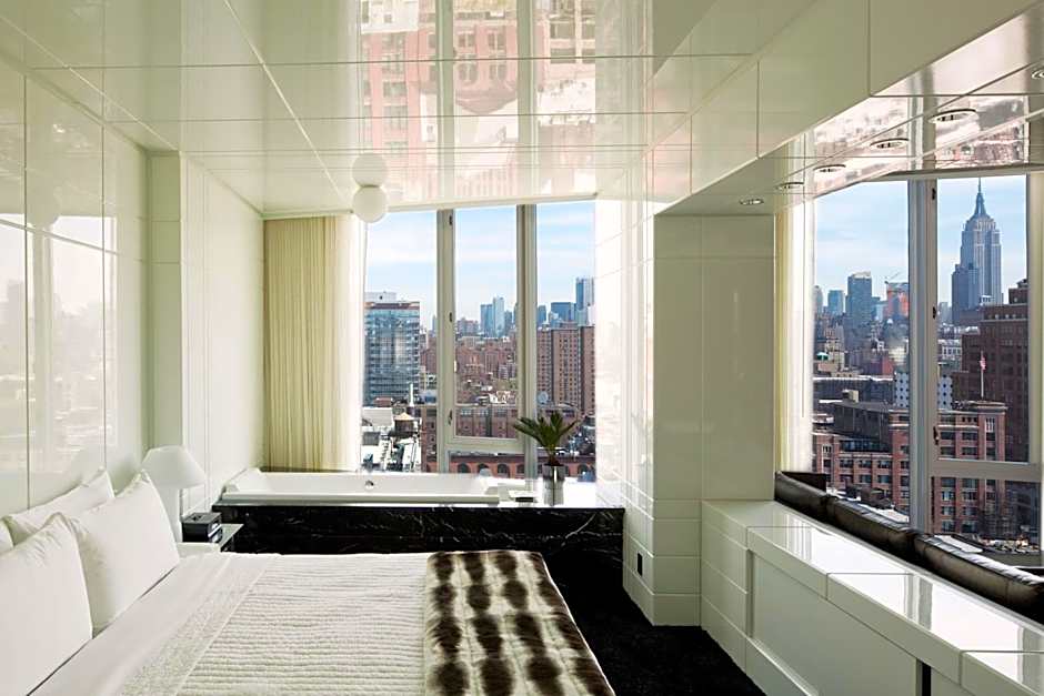 With floor-to-ceiling, wall-to-wall windows looking out into the kaleidoscope of the big city, this room offers a queen-size bed, a working/dining/lounging alcove, and a rain shower with big city views. Cozy hooded robes, a Bluetooth speaker, and an overstocked mini-bar come standard, naturally. Some rooms have a bath tub.